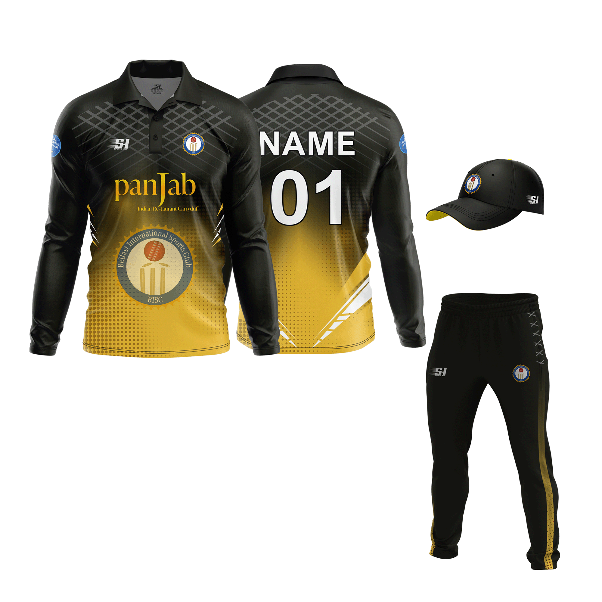 Belfast International Sports Club BISC official black and gold playing jersey club range bundle